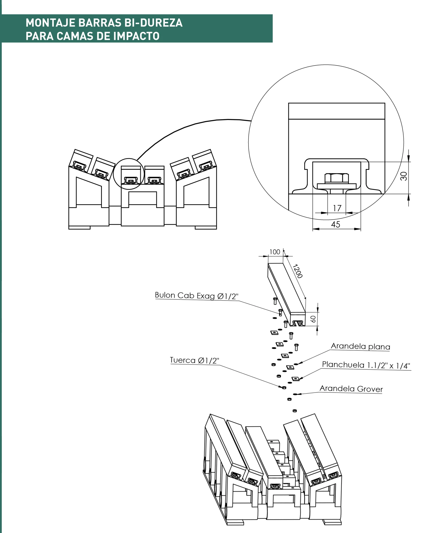 Las barras Bi-Dureza para cama de impacto son elementos diseñados para absorber la fuerza del material que cae sobre la cinta transportadora, con el fin de evitar daños en la misma y en la estructura que la soporta.